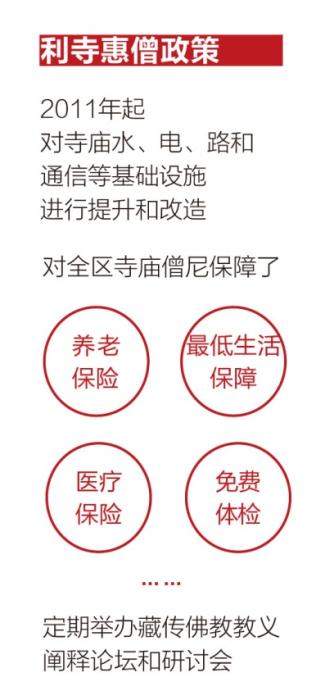 西藏出臺了一系列利寺惠僧政策,對全區(qū)寺廟僧尼保障了養(yǎng)老保險、最低生活保障、醫(yī)療保險、重大疾病醫(yī)療保險、免費(fèi)體檢等。同時定期舉辦藏傳佛教教義闡釋論壇和研討會,鼓勵藏傳佛教界代表人士對藏傳佛教經(jīng)典教義作出符合國家法律法規(guī)、社會主義核心價值觀和中華優(yōu)秀傳統(tǒng)文化精神的新闡釋,藏傳佛教中國化邁出了新步伐。
