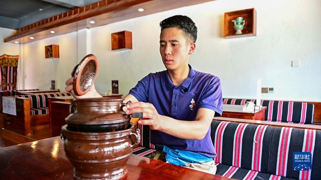 在拉薩市墨竹工卡縣,洛桑益西在自己開的藏餐店內(nèi)展示作為藏式牛肉湯容器的塔巴陶瓷(6月23日攝)。新華社記者 周荻瀟 攝