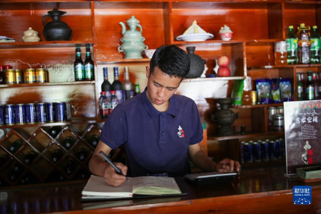 在拉薩市墨竹工卡縣,洛桑益西在自己開的藏餐店內(nèi)算賬(6月23日攝)。新華社記者 姜帆 攝