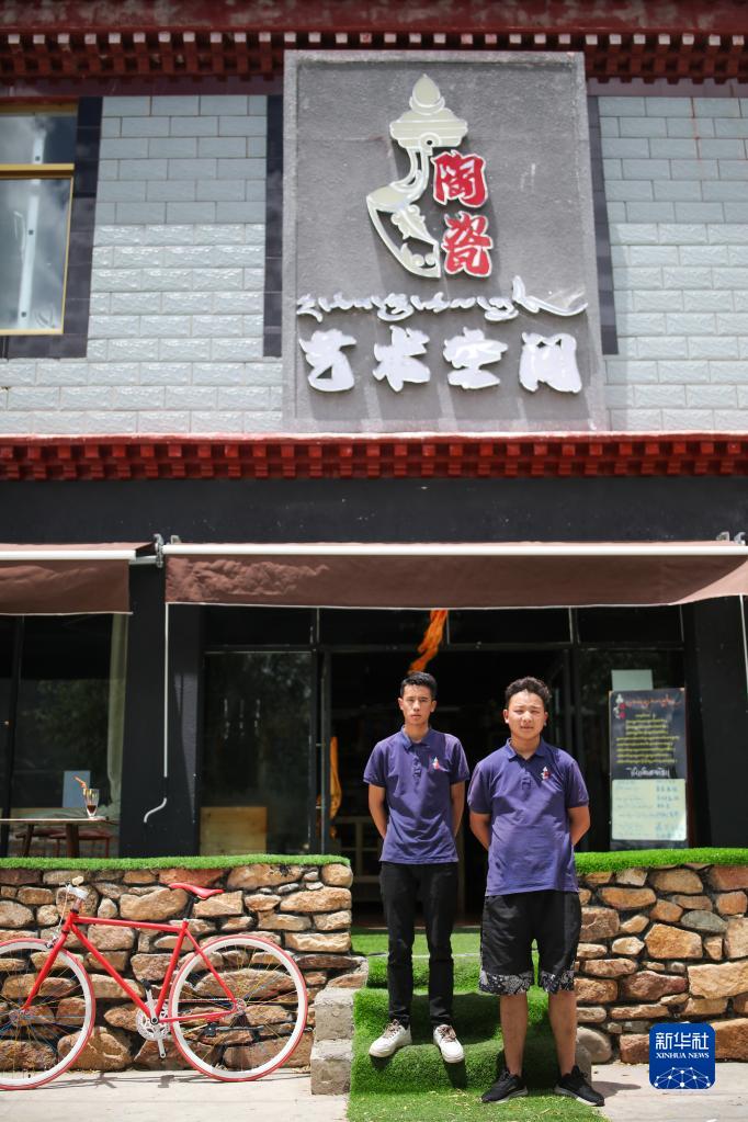 洛桑益西(左)與學(xué)徒在藏餐店門前(6月23日攝)。新華社記者 姜帆 攝