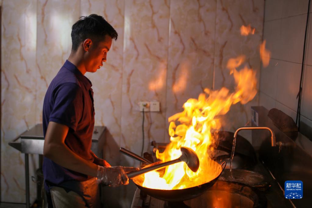 在拉薩市墨竹工卡縣,洛桑益西在自己開的藏餐店內(nèi)炒菜(6月23日攝)。新華社記者 姜帆 攝