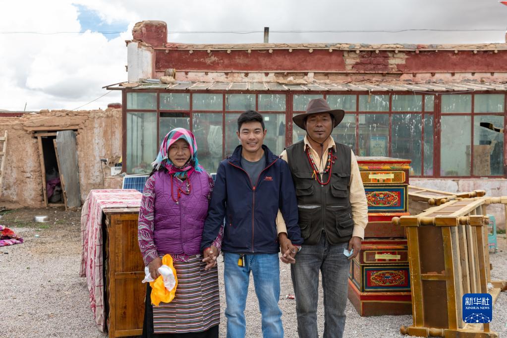 雙湖縣多瑪鄉(xiāng)果根擦曲村牧民貢覺多吉(中)和父母在老房子前合影。他們搬運的家具不多,準(zhǔn)備在新家添置新家具(7月12日攝)。新華社記者 周荻瀟 攝