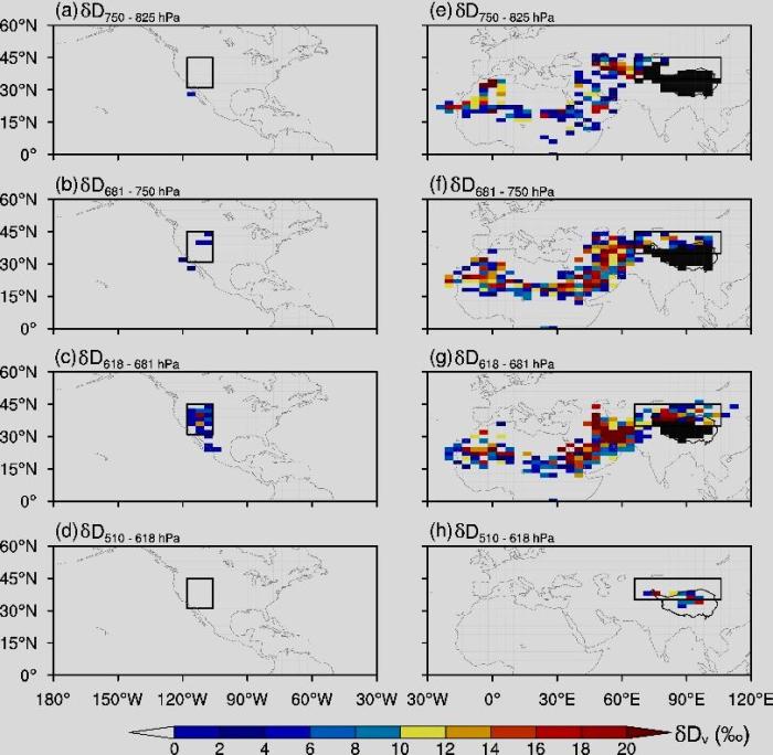 夏季美國(guó)西部和亞洲干旱區(qū)不同層水汽穩(wěn)定同位素的“反高程效應(yīng)”的空間分布格局。 中科院青藏高原所 供圖