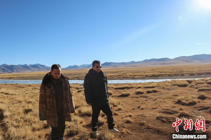 王軍強(qiáng)(右)在申扎縣巴扎鄉(xiāng)查藏藏布巡河。申扎縣委宣傳部 供圖