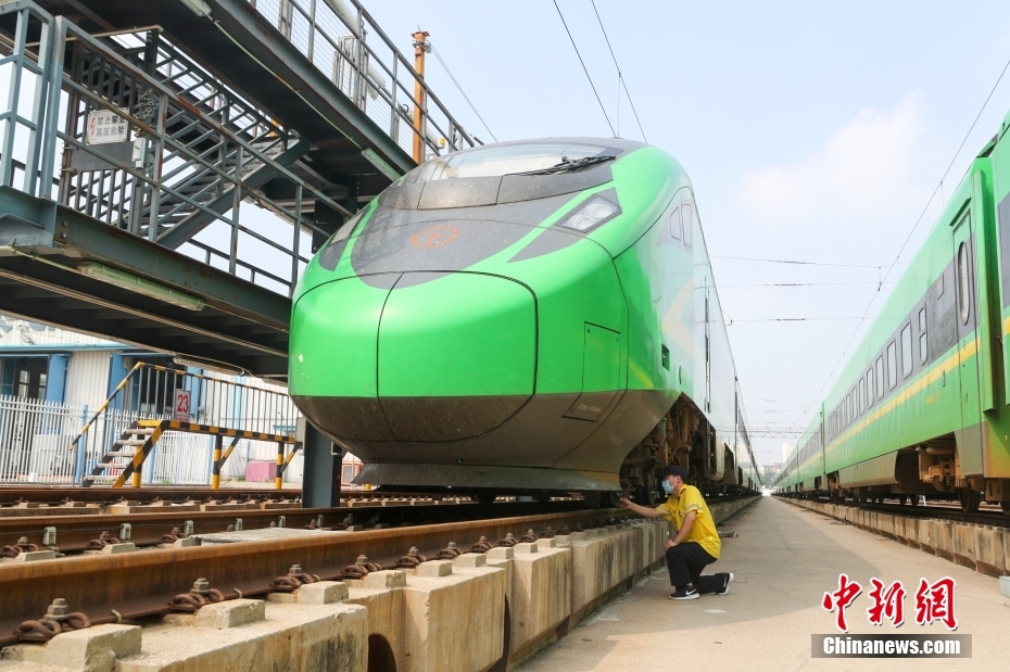 8月17日,北京車輛段西庫(kù)檢車間,檢修人員剛剛完成一列時(shí)速160公里動(dòng)力集中型復(fù)興號(hào)動(dòng)車組(俗稱“綠巨人”)的檢修工作。這里是京津冀地區(qū)唯一的“綠巨人”檢修維修基地,肩負(fù)著18列共計(jì)261節(jié)車輛的檢修任務(wù)。隨著暑運(yùn)逐漸迎來返校返程高峰,檢修人員也在加班加點(diǎn)為列車做好體檢工作,確保運(yùn)行安全。 中新社記者 賈天勇 攝