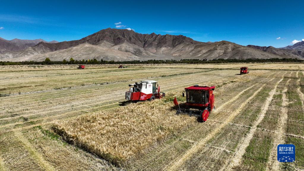 西藏日喀則市江孜縣熱索鄉(xiāng)努康村農(nóng)機(jī)合作社的村民集中對村里三千多畝耕地進(jìn)行機(jī)械化收割(9月19日攝)。新華社記者 晉美多吉 攝