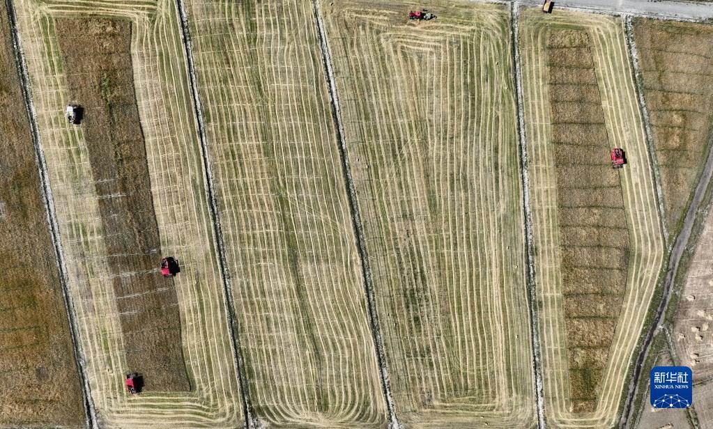 西藏日喀則市江孜縣熱索鄉(xiāng)努康村農(nóng)機(jī)合作社的村民集中對村里三千多畝耕地進(jìn)行機(jī)械化收割(9月19日攝,無人機(jī)照片)。新華社記者 晉美多吉 攝