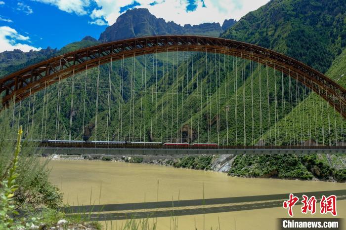 圖為一列火車(chē)經(jīng)過(guò)西藏雅魯藏布江藏木大橋?!〗w波 攝