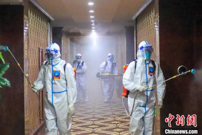 西藏森林消防隊(duì)員對(duì)隔離酒店進(jìn)行覆蓋式消殺。 西藏森林消防總隊(duì) 供圖