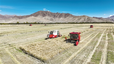 西藏日喀則市江孜縣熱索鄉(xiāng)努康村農(nóng)機合作社的村民集中對村里三千多畝耕地進行機械化收割新華社記者 晉美多吉攝
