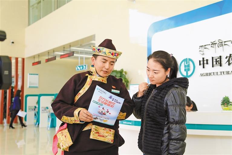 農(nóng)行西藏分行員工輔導(dǎo)客戶(hù)使用掌上銀行辦理業(yè)務(wù)。