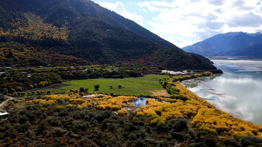 進(jìn)入深秋,西藏多地已飄下皚皚白雪,米林則依然保持著“雪域江南”的底色,在低海拔地區(qū)甚至還可以找到盛開(kāi)的小花;往上,就是秋的顏色,豐茂的樹(shù)林鑲嵌著縷縷金黃,漸次更替;再往上,越來(lái)越多的山頂開(kāi)始戴上“白色的帽子”,這是雪域高原的本色。春夏秋冬好像都在這個(gè)季節(jié)相遇。