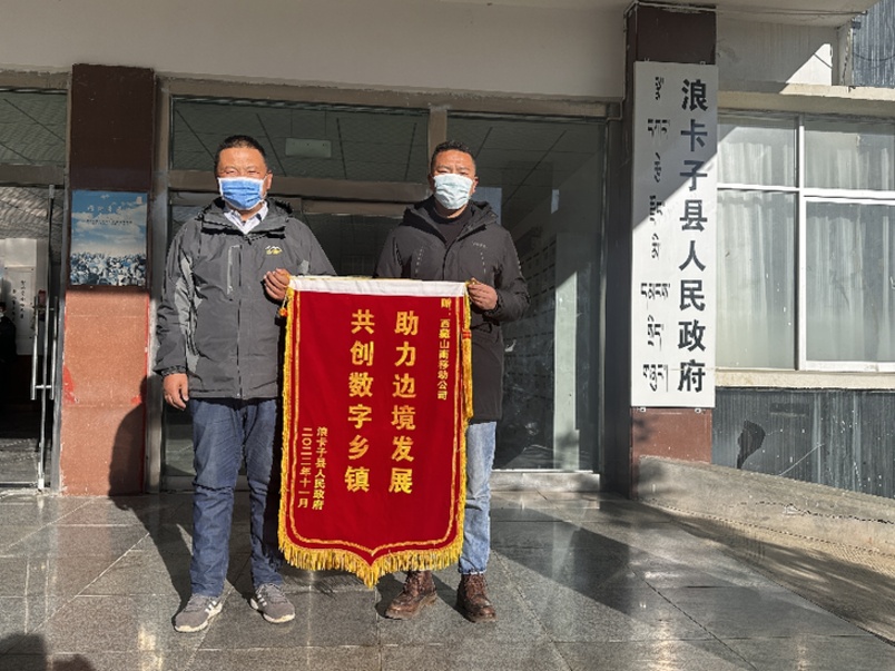 浪卡子縣政府向中國移動(dòng)山南分公司授予“助力邊境發(fā)展 共創(chuàng)數(shù)字鄉(xiāng)鎮(zhèn)”錦旗。