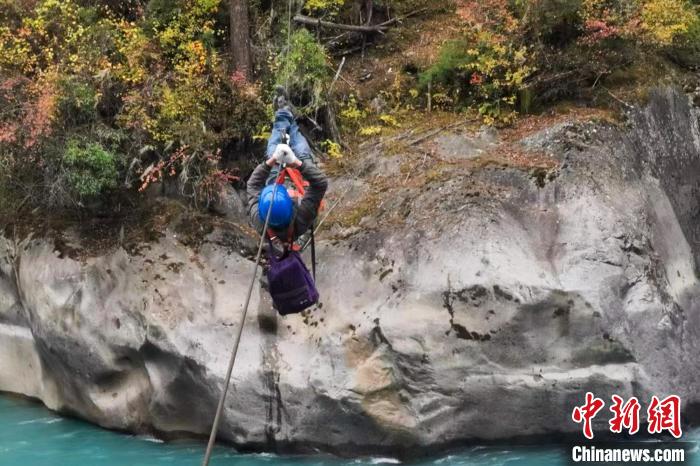 圖為朗尼在巡線完成返回時(shí)溜索過(guò)江。 國(guó)網(wǎng)波密縣供電服務(wù)中心 供圖