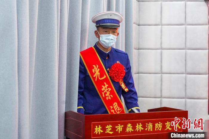 圖為楊?lèi)?ài)軍代表退出消防員深情發(fā)言?!钣例?攝