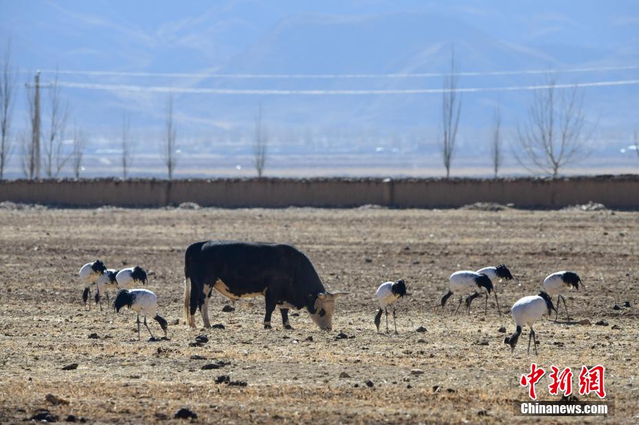 每年的10月底,成群的黑頸鶴飛到西藏拉薩市林周縣越冬,在拉薩市林周縣周邊的湖泊濕地度過5個月的“閑云野鶴”生活,次年三四月份再飛向藏北草原繁殖。黑頸鶴是世界上唯一一種高原鶴類。具有足長、喙長、頸長的典型涉禽類特征,適合在沼澤地里行走。黑頸鶴的頸、尾為黑色,體羽為灰白色。黑頸鶴是國家一級保護(hù)動物。目前,每年到林周縣越冬的黑頸鶴已達(dá)2000只左右。圖為黑頸鶴在林周境內(nèi)的農(nóng)田里覓食、嬉戲。 貢嘎來松 攝
