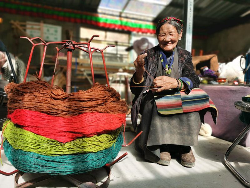 雖然編織坊一直在創(chuàng)新、進步,但是傳統(tǒng)不能丟。次仁卓瑪?shù)乃罂棽妓嚰寄苁菐资旯αΦ某恋?,她在這里擔任老師的角色,傾囊相授。“從來沒有想過有一天在家門口上班領工資,心里頭敞亮了?,F(xiàn)在我老了,但是這些手藝要傳下去?!弊詮膩淼骄幙椃?,75歲的次仁卓瑪老人臉上的笑容就沒消失過。