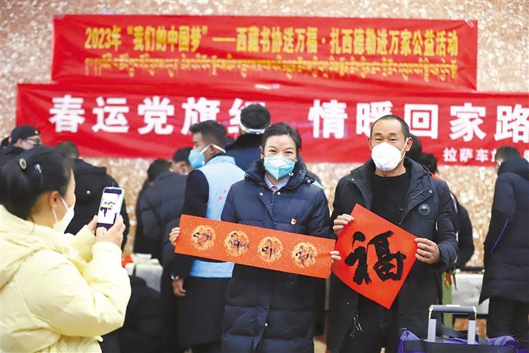 7日,拉薩火車站“天路格桑花”黨員突擊隊開展兔年大吉心愿墻、新春猜謎送祝福等活動,提升鐵路運輸服務品質(zhì),讓旅客安心、順心出行。圖為拉薩火車站的工作人員將“福”字送給旅客。記者 楊小娟 旦增蘭澤 攝