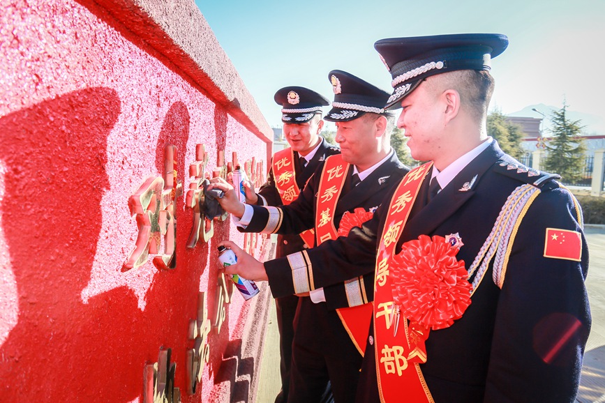 圖為1月10日,拉薩鐵路公安處功模代表共同為“四句話、十六字”訓詞墻描紅,擦亮忠誠底色。胡傳鑫攝