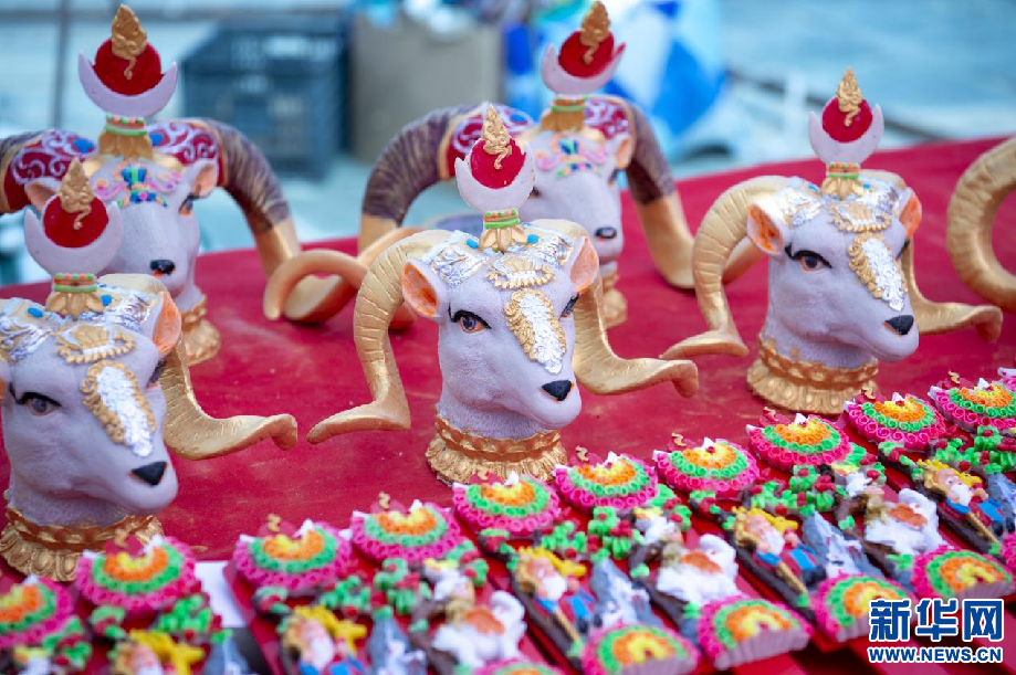 圖為年貨市場上的吉祥羊頭(1月20日攝)。 新華網(wǎng) 旦增努布 攝