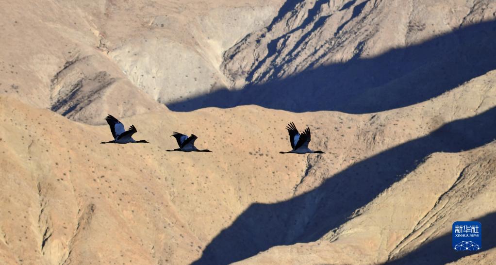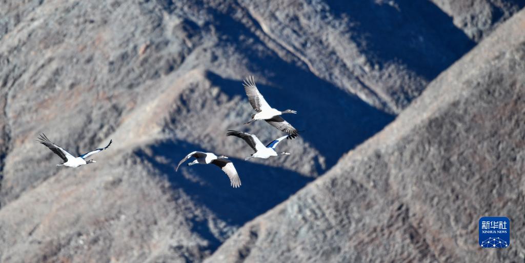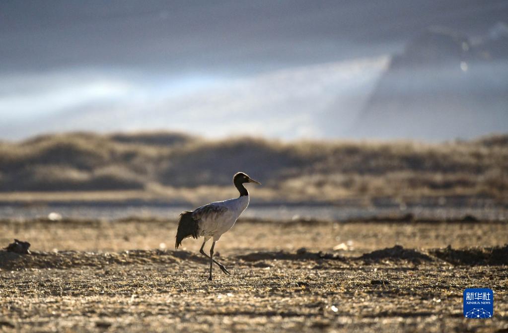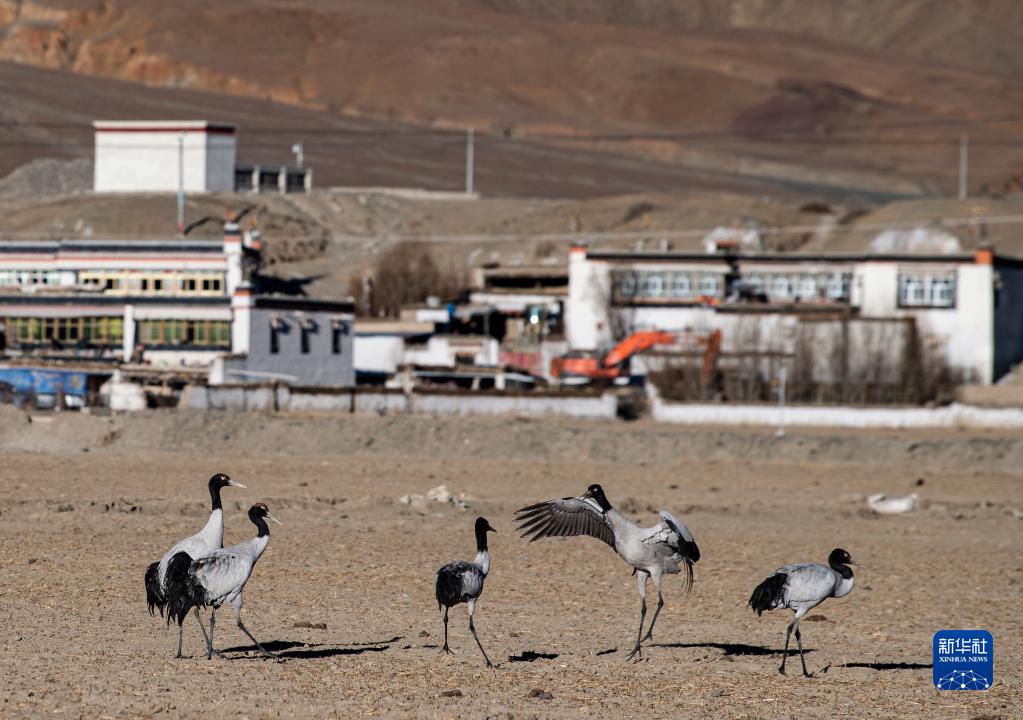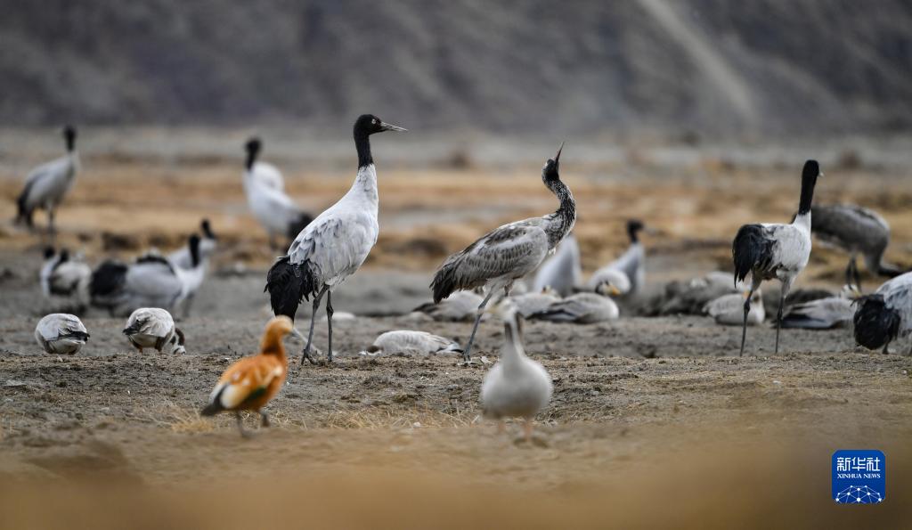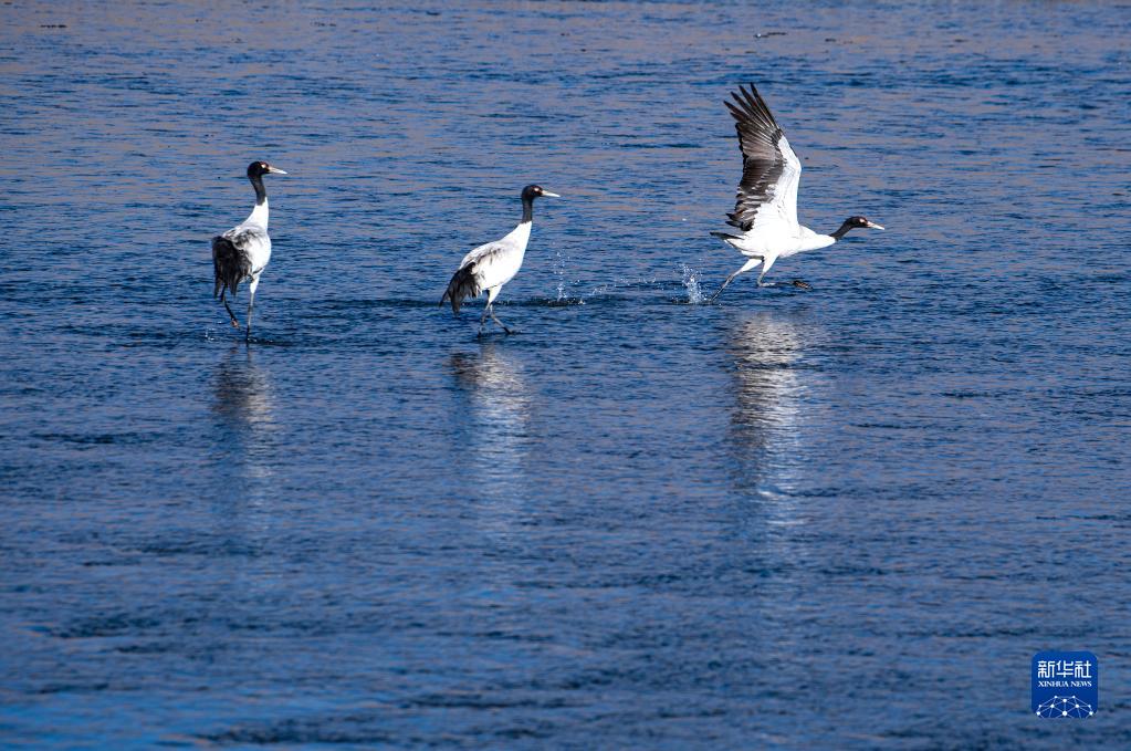 在西藏雅魯藏布江中游河谷黑頸鶴國家級(jí)自然保護(hù)區(qū)日喀則市拉孜縣越冬的黑頸鶴(1月23日攝)。新華社記者 孫非 攝