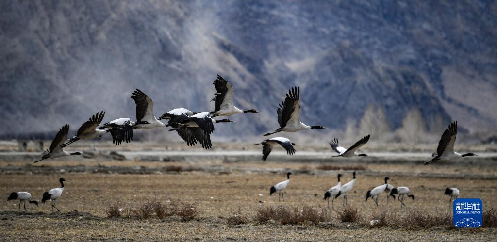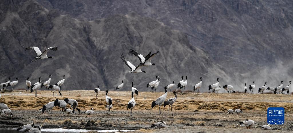 在西藏雅魯藏布江中游河谷黑頸鶴國家級(jí)自然保護(hù)區(qū)日喀則片區(qū)拉孜縣附近,大量越冬的黑頸鶴翩翩起舞,迎接春天的到來。