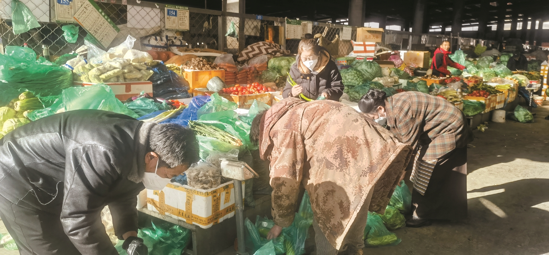 圖為在拉薩東嘎農(nóng)副產(chǎn)品批發(fā)市場(chǎng)蔬菜銷售區(qū),市民在購(gòu)買蔬菜。拉薩融媒記者 楊 璐攝