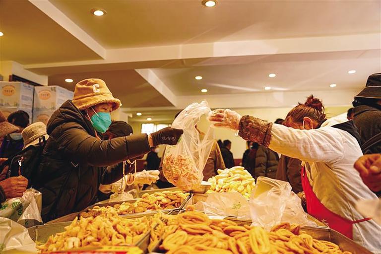不遠(yuǎn)處,尼珍藏式卡塞店的店員們正忙著制作“卡塞”,揉面、切割、染色,面片經(jīng)店員們的巧手捏成長條形、圓形、蝴蝶形等不同樣式,最后放到油鍋炸至金黃,出鍋后瀝油再撒上白糖,香甜可口、樣式精美的卡塞就制作完成了。新鮮出爐的卡塞顏色金黃、香氣四散開來,市民們爭(zhēng)相選購?!拔覀冏隹ㄈ呀?jīng)25年了,今年1月10日開門營業(yè),很多老顧客就來光顧了,每天收入在2000元至3000元之間,而且我們選用的原材料比較好,再加上現(xiàn)場(chǎng)制作、新鮮銷售,生意好的時(shí)候賣得更多。”老板尼珍告訴記者:“我們店制作的卡塞價(jià)格實(shí)惠,連續(xù)8年沒有漲價(jià),每斤30元,今年準(zhǔn)備營業(yè)到藏歷十二月二十九(公歷2月19日)歇業(yè)?!?/p>