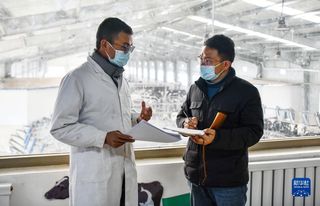 扎西江村(右)在隆子縣一家標準化奶牛養(yǎng)殖基地調研當?shù)禺a(chǎn)業(yè)發(fā)展和帶動群眾增收情況(2月14日攝)。新華社記者 晉美多吉 攝