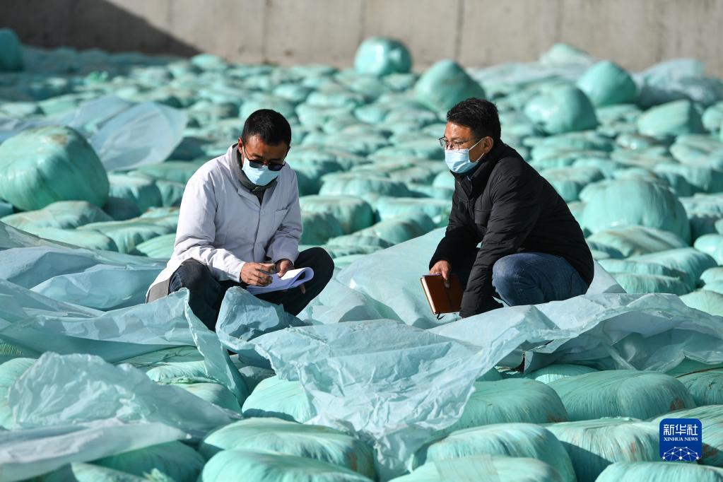 扎西江村(右)在隆子縣一家標準化奶牛養(yǎng)殖基地查看牛飼料,調研當?shù)禺a(chǎn)業(yè)發(fā)展情況(2月14日攝)。新華社記者 晉美多吉 攝