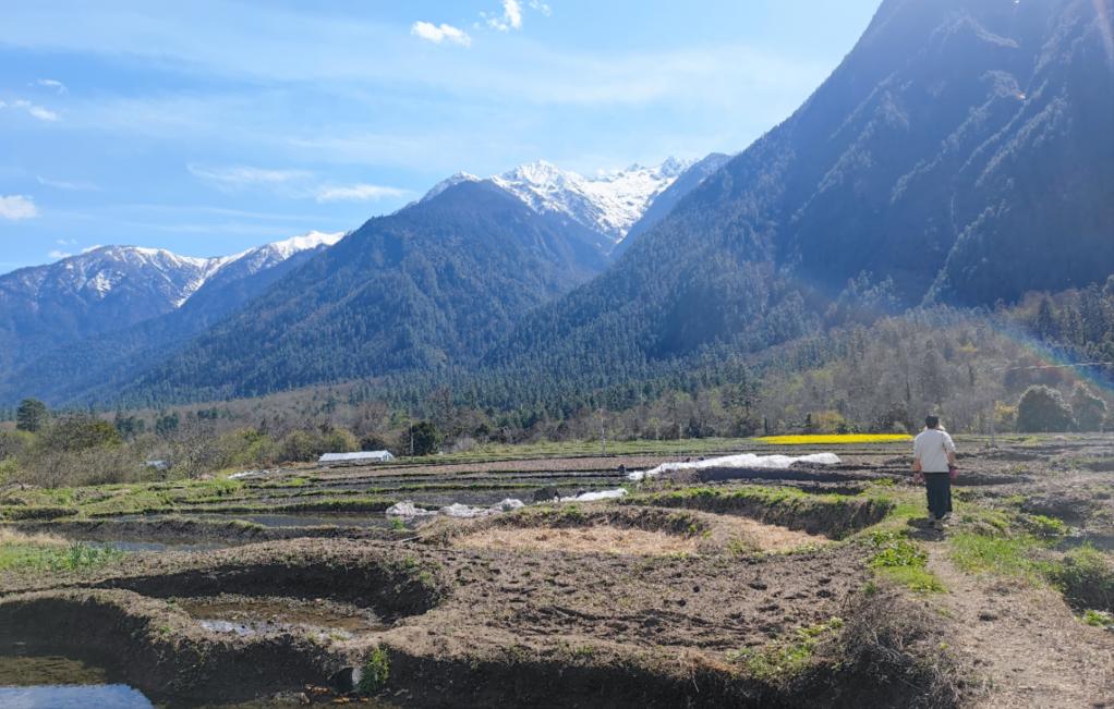 西巴村一片片沃野鑲嵌在翠綠的山巒之間,油菜花、桃花點綴其間,映著遠處的雪山,勾勒出一幅色彩斑斕的圖景。
