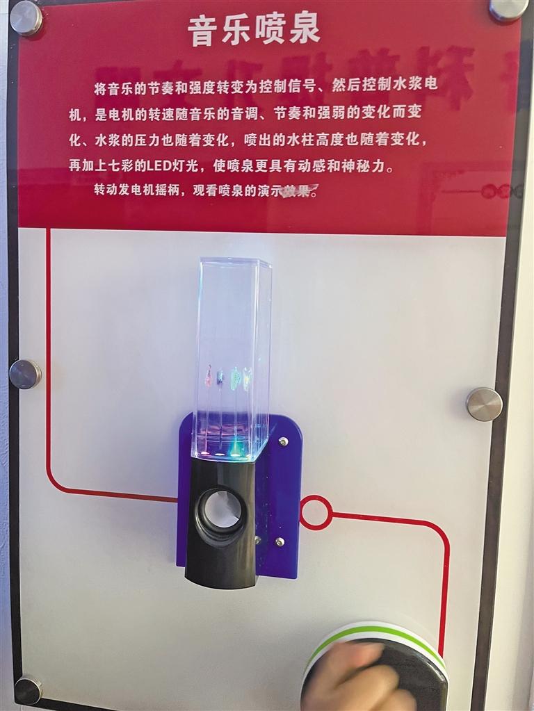 “這個體驗項目叫‘天上來水’。設計者巧妙設計水流通過水泵及透明玻璃管壓入水龍頭內,在封閉的水龍頭出口處將水溢出管口,溢出的水又將玻璃管隱蔽,水流的循環(huán)造成觀眾難以發(fā)現(xiàn)特殊裝置的奧秘,從而形成人為制造的錯覺?!斌w驗結束后,索央向小朋友解釋“天上來水”的科學原理。