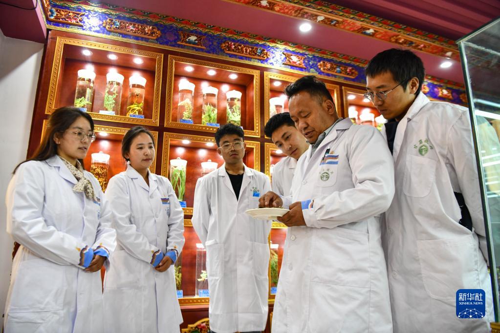 在藏藥材標(biāo)本室,普窮次仁為學(xué)生講解藏藥材知識(shí)(4月20日攝)。新華社記者 晉美多吉 攝