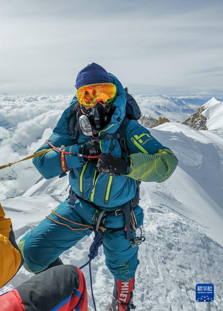 董紅娟在海拔8027米的希夏邦馬峰頂(4月26日攝)。新華社發(fā)(頓巴 攝)