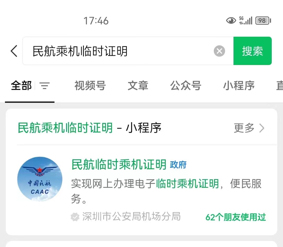 3、請您出示與購票時一致的有效證件辦理乘機手續(xù),以免因證件不符耽誤行程。如身份證過期或丟失,您可以在微信小程序和支付寶頁面搜索“民航臨時乘機證明”小程序進行辦理。