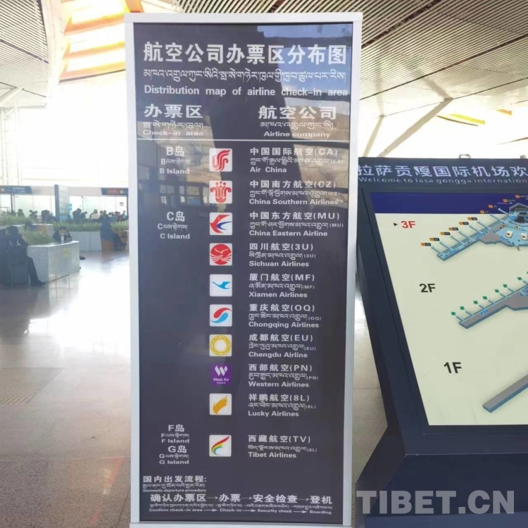無托運行李的旅客持個人身份證(或有效證件)前往自助值機區(qū)打印登機牌。有托運行李和中轉(zhuǎn)聯(lián)程航班的旅客前往人工柜臺辦理。其中,乘坐西藏航空公司航班的旅客進入出發(fā)大廳后左轉(zhuǎn)前往F、G島辦理乘機手續(xù),其他航空公司的旅客請前往B、C、D島辦理乘機手續(xù)。