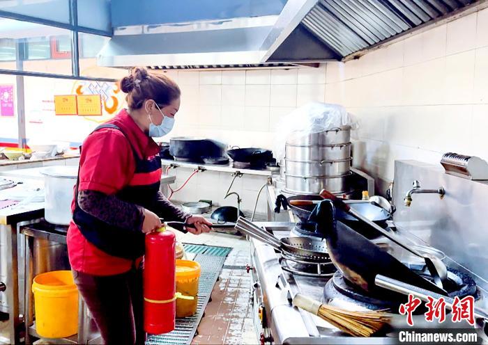 模擬廚房發(fā)生火災(zāi),員工發(fā)現(xiàn)火源后,立即關(guān)閉燃?xì)忾y,拉閘斷電,第一時間利用周邊滅火器進(jìn)行初期火災(zāi)撲救?!㈣?攝