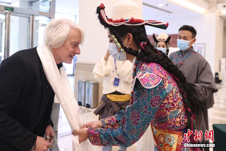5月23日,“2023·中國西藏發(fā)展論壇”在北京舉行。會場外,活潑獨(dú)特的藏式迎賓舞蹈、展示西藏人文自然風(fēng)貌的圖片,已在論壇開幕前預(yù)熱起探討西藏新發(fā)展的氛圍。圖為著名紀(jì)錄片導(dǎo)演、全球化智庫(CCG)高級研究員龍安志(Lawrence Brahm)接受哈達(dá)。