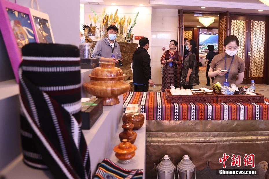 5月23日,“2023·中國西藏發(fā)展論壇”在北京舉行。會場外,活潑獨(dú)特的藏式迎賓舞蹈、展示西藏人文自然風(fēng)貌的圖片,已在論壇開幕前預(yù)熱起探討西藏新發(fā)展的氛圍。圖為展臺上,布置著色彩豐富的藏式布匹、紙藝文創(chuàng)產(chǎn)品、藏香、酥油茶等。