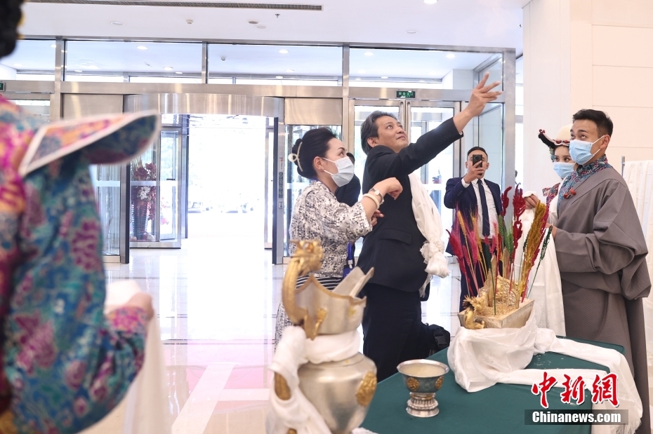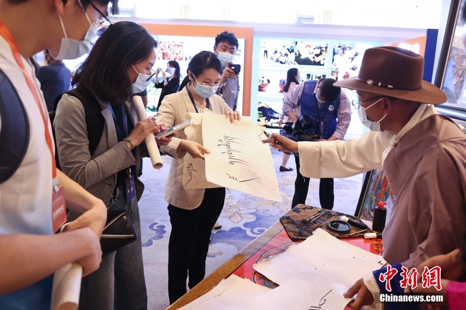5月23日,“2023·中國西藏發(fā)展論壇”在北京舉行。會場外,活潑獨(dú)特的藏式迎賓舞蹈、展示西藏人文自然風(fēng)貌的圖片,已在論壇開幕前預(yù)熱起探討西藏新發(fā)展的氛圍。圖為藏族藝人現(xiàn)場進(jìn)行藏文書法創(chuàng)作并將作品贈(zèng)送給來賓。