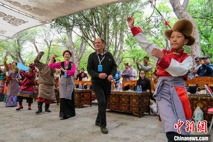 圖為5月19日,柯馬凱在拉薩羅布林卡聽藏戲,和當?shù)夭刈迕癖娨坏捞伹f舞。中新社記者 江飛波 攝
