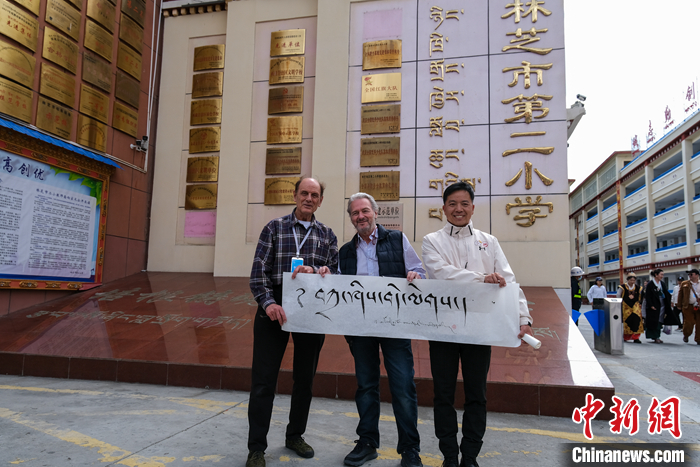 圖為5月18日,柯馬凱(左一)在林芝市第二小學參訪時獲得學校贈予的藏文書法作品“扎西德勒”。中新社記者 江飛波 攝