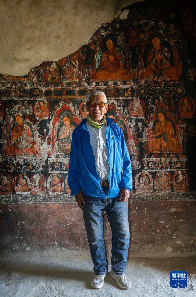 5月26日,仁增旺扎老人在皮央石窟的壁畫(huà)前留影。新華社記者 費(fèi)茂華 攝