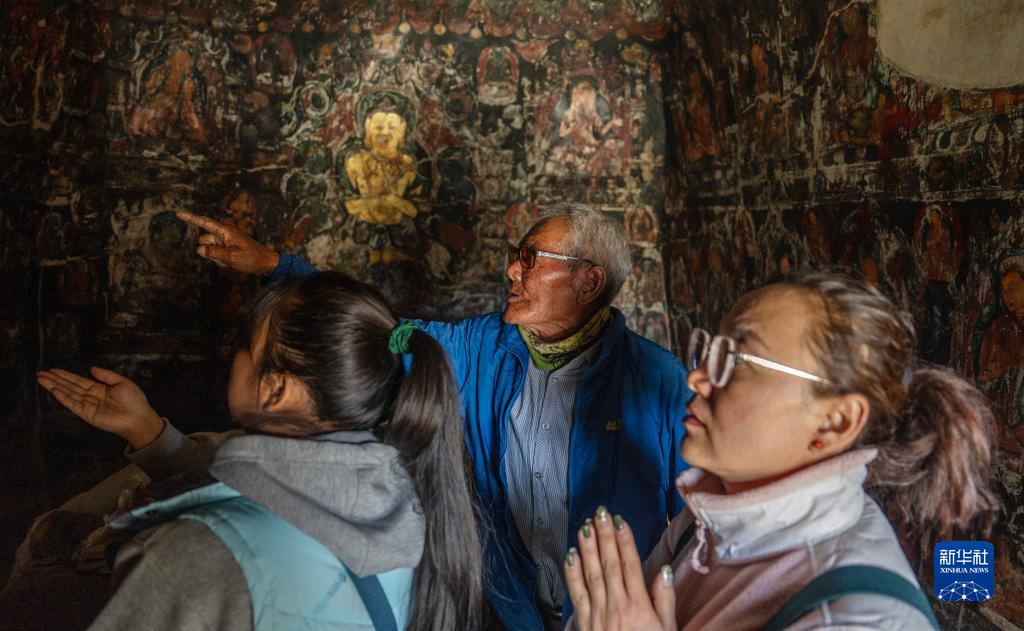 5月26日,仁增旺扎老人(中)在為游客介紹壁畫(huà)。新華社記者 費(fèi)茂華 攝