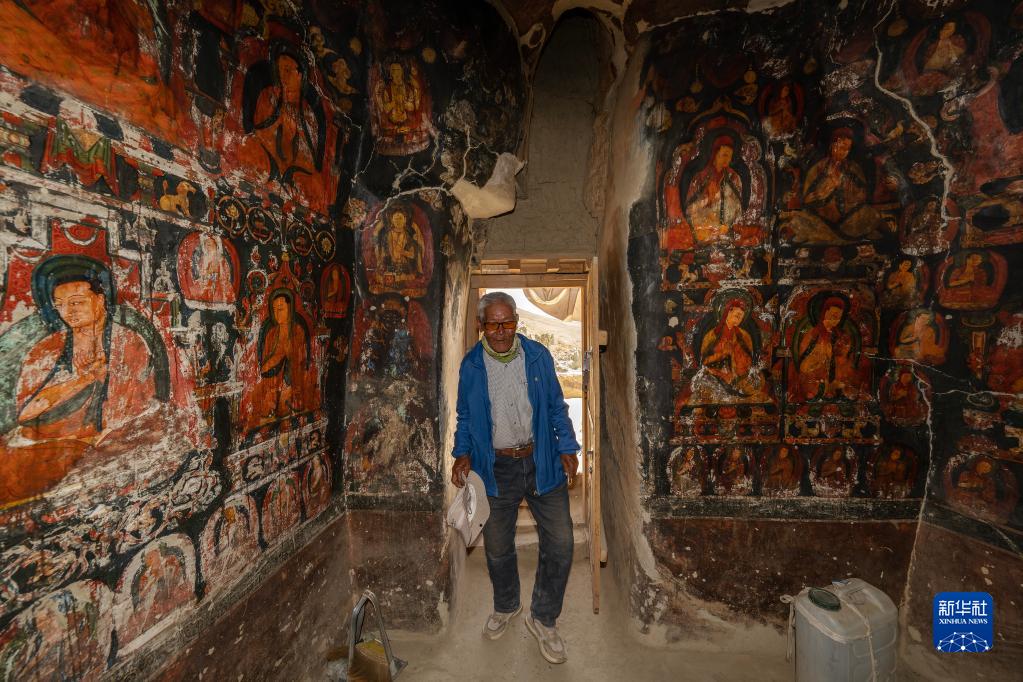 5月26日,仁增旺扎老人走進(jìn)繪滿壁畫(huà)的石窟。新華社記者 費(fèi)茂華 攝