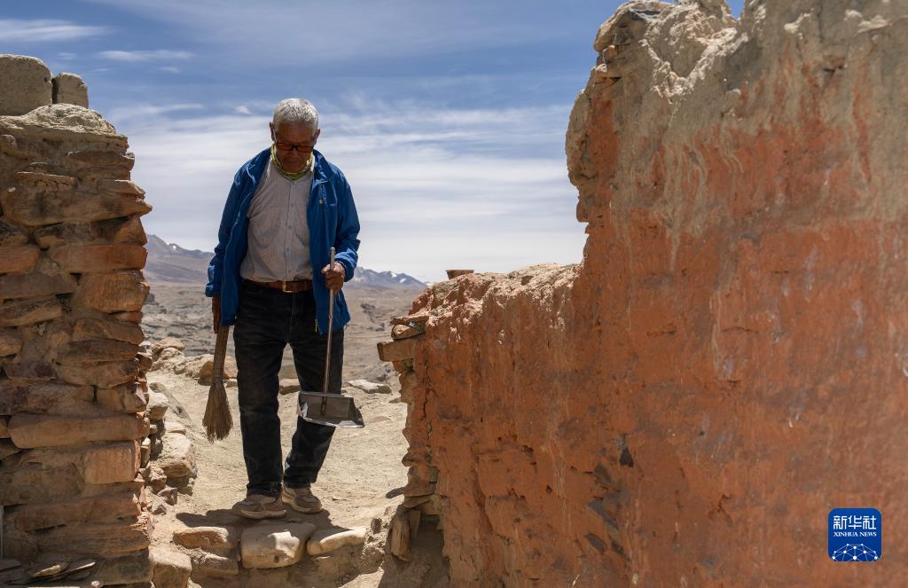 5月26日,仁增旺扎老人準(zhǔn)備打掃石窟。新華社記者 費(fèi)茂華 攝