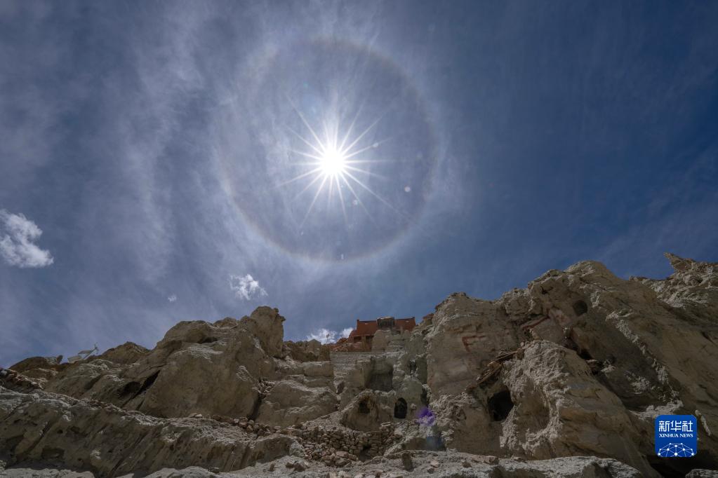 5月26日,日暈出現(xiàn)在皮央石窟群所在的小山上空。新華社記者 費(fèi)茂華 攝