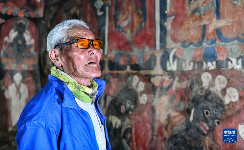 仁增旺扎老人查看壁畫(huà)(5月26日攝)。新華社記者 晉美多吉 攝