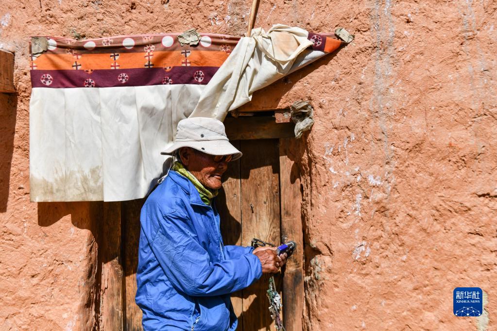 仁增旺扎老人打開(kāi)其中一間還留存有壁畫(huà)的石窟大門(mén)(5月26日攝)。新華社記者 晉美多吉 攝
