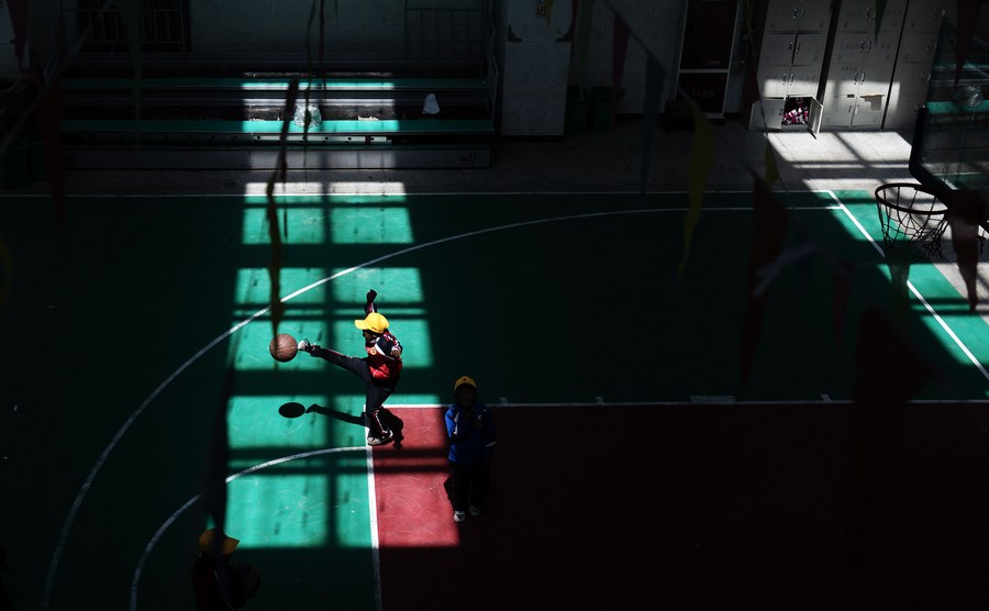 6月5日,扎西宗鄉(xiāng)完全小學學生在籃球課上投籃。